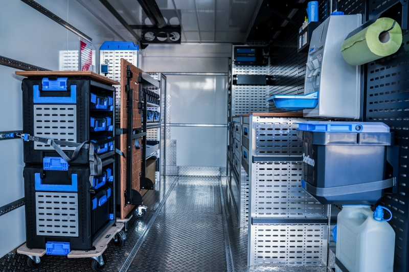 Im Inneren sorgt eine durchdachte Struktur aus Fahrzeugeinrichtung, »BOXXen« und »WorkMo«-Elementen dafür, dass jedes Werkzeug seinen festen Platz hat und unmittelbar einsatzbereit ist. Ergänzt wird der mobile Arbeitsplatz durch eine verlässliche Stromversorgung, zusätzliche Arbeitsflächen und eine integrierte Möglichkeit zur Handhygiene – Elemente, die im Ernstfall entscheidend sein können.
