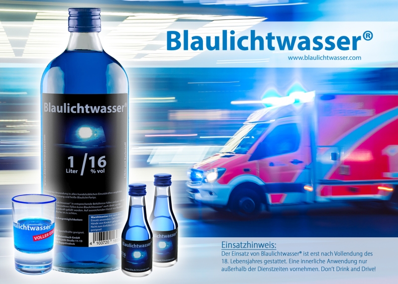 »Blaulichtwasser« ist als Getränkekonzept für BOS-Veranstaltungen angelegt. Das Sortiment umfasst Likörflaschen in verschiedenen Größen, Rezeptideen für Cocktails sowie ein Heißgetränk für die kalte Jahreszeit. Ergänzt wird das Angebot durch Werbemittel wie Plakate, Banner und Thekenaufsteller sowie durch passende Gläser, neu gestaltete Tassen und einen eigenen Social-Media-Auftritt.
