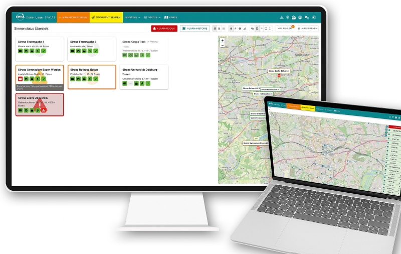 Mit dem neuen Sirenen-Management-Modul der Einsatzmanagement-Software »EMMA« behalten Leitstellen den Zustand ihres Sirenennetzes jederzeit im Blick. Das Tool schafft Transparenz über Verfügbarkeit und Funktion der Warnsirenen und ermöglicht eine gezielte, nachvollziehbare Alarmierung – direkt aus dem Dashboard.