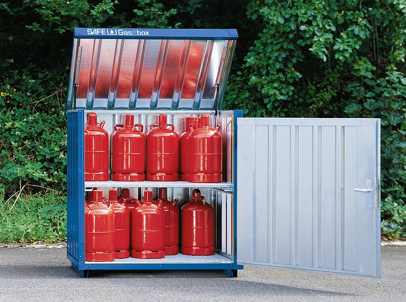 Gasflaschenbox: Gitterrostebenen schaffen Übersicht und das aufklappbare Dach erleichtert die Entnahme (Bild: Säbu).
