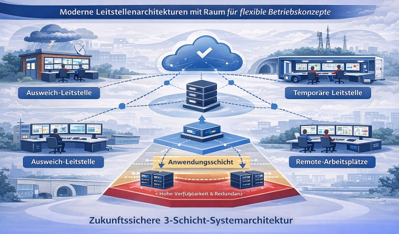 Dezentrale Betriebskonzepte gewinnen daher an Bedeutung. Dazu zählen Ausweichleitstellen, temporäre Leitstellenstrukturen sowie unter definierten organisatorischen und sicherheitstechnischen Rahmenbedingungen Remote-Arbeitsplätze für Calltaking oder Disposition.